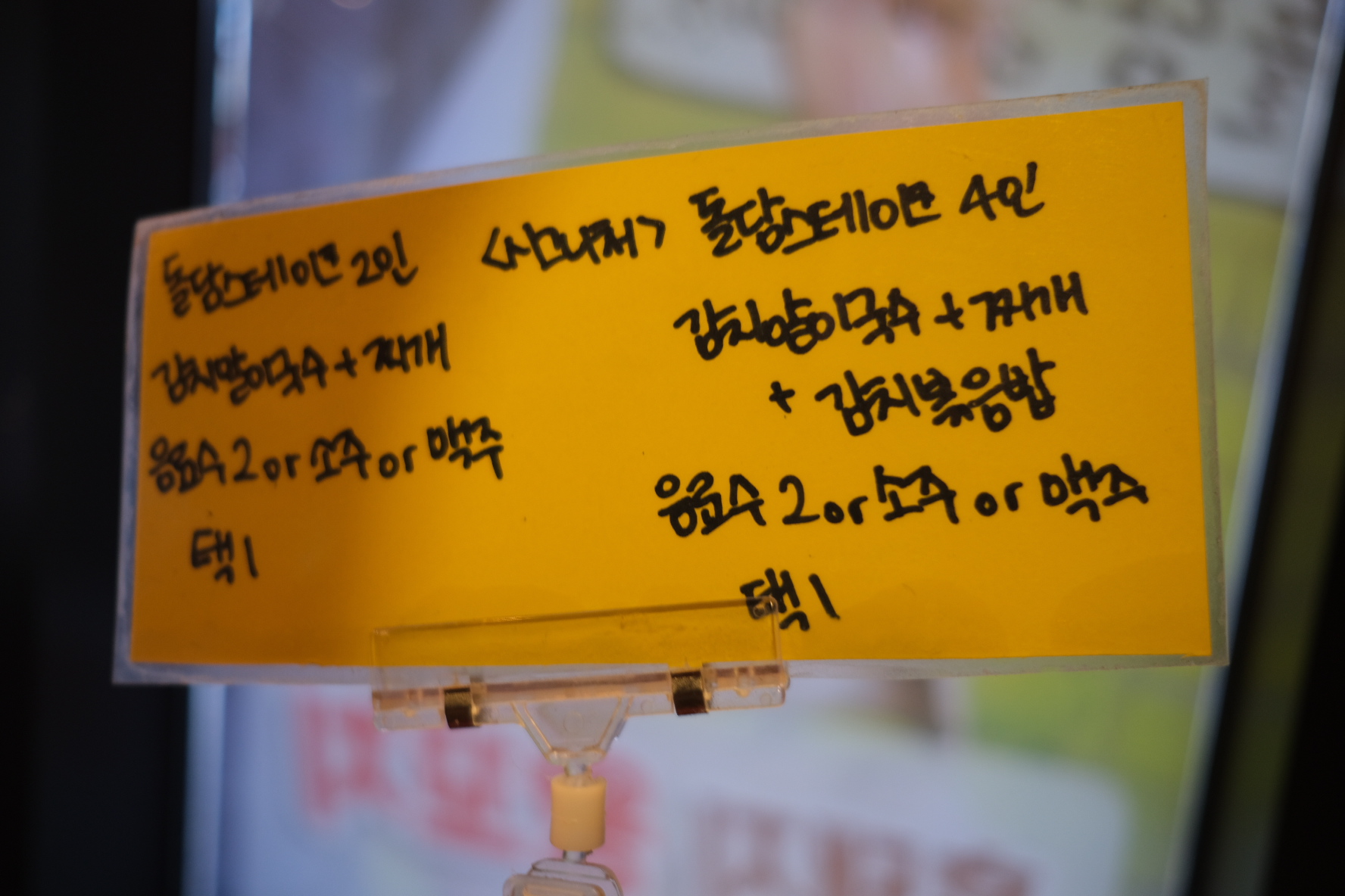 - 어딜 가나 뭐가 좋은지 모르겠으면 세트메뉴를 시키는데 위 사진처럼 따로 포스트잇으로 적혀있는 세트메뉴가 있다. 돌담스테이크, 김치말이국수와 찌개, 음료까지 나오는 2인메뉴는 와이프와 나, 우리 아이까지 만족시키기에는 충분했다. 물론 아이는 어린이메뉴(어린이짜장)를 함께 먹었지만 그 어린이짜장 또한 맛이 훌륭해서 어른인 아빠가 먹기에도 충분한 맛이었다. 고기가 느끼할 때쯤 김치말이국수 한 입하면 다시 또 흡입할 수 있는 고기, 구운 고기를 조금 더 넣어 더 맛있는 찌개를 만들어먹으면 정말 금상첨화를 느낄 수 있다.