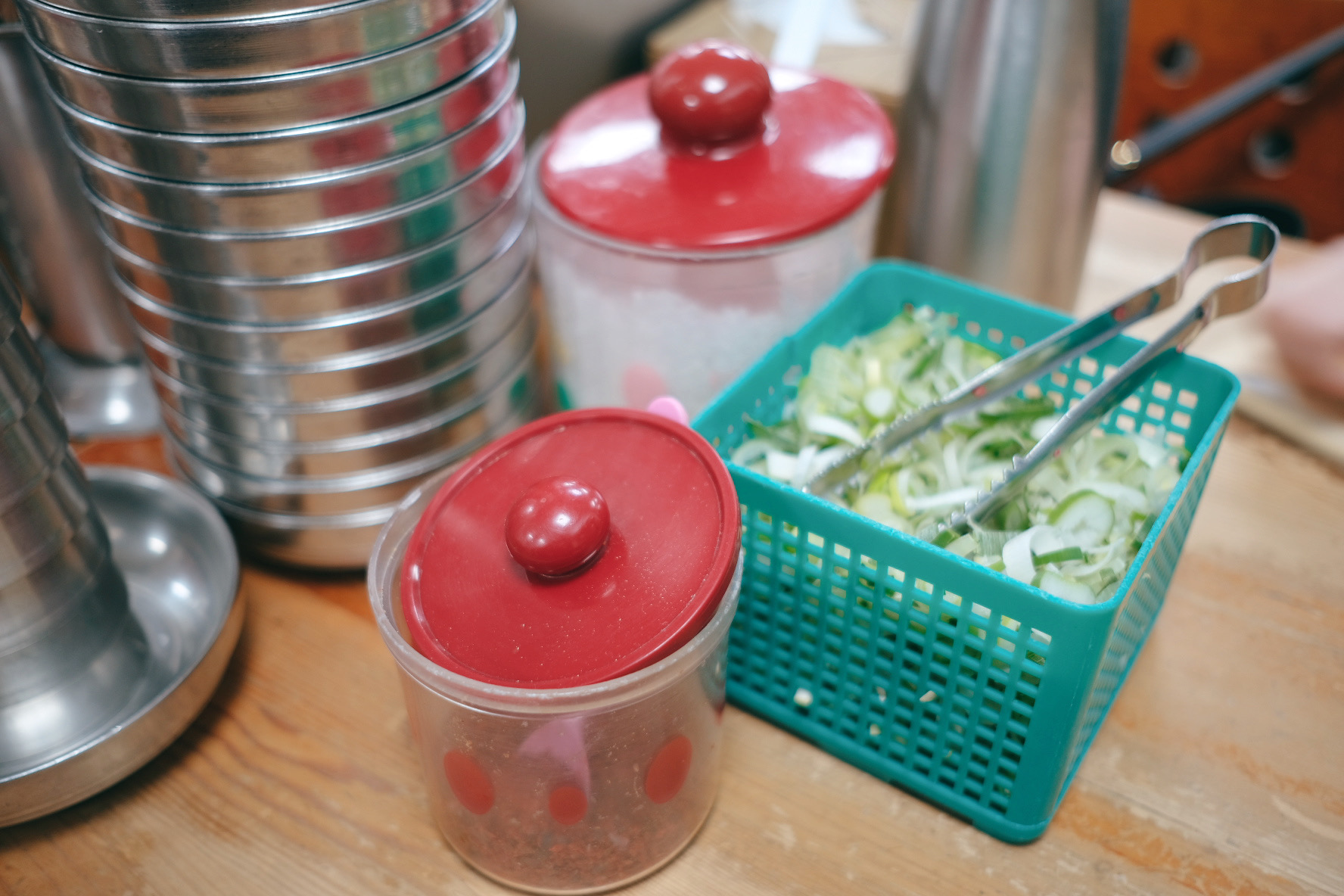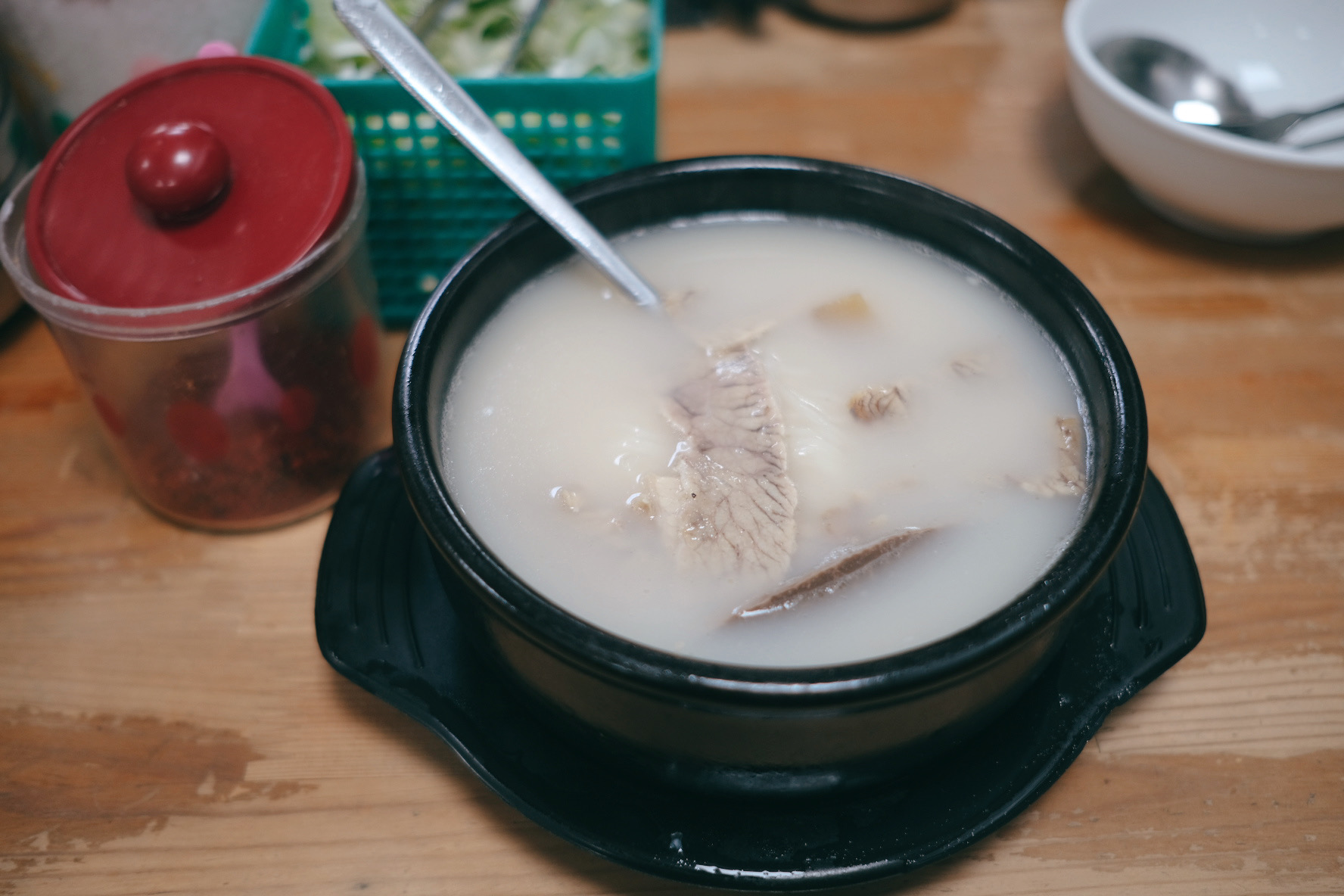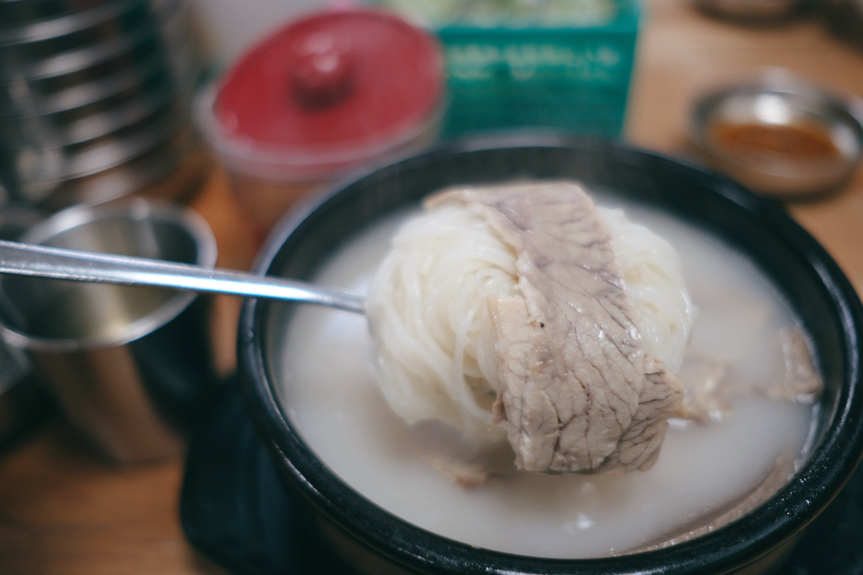 처음 국물 맛만 보았을 땐 조금 슴슴한 맛이었으나 대파와 소금, 약간의 고춧가루가 첨가되니 아주 훌륭한 맛이 되었습니다. 셀프로 먹을 수 있게 테이블마다 비치된 김치와 깍두기는 셀프바로 이동할 필요가 없어 좋았는데 특히나 깍두기 맛이 아주 훌륭했습니다. 대량구입해 오는 깍두기는 어쩐지 단맛이 강한데 여긴 단맛보단 신맛이 좀 더 나는 게 직접 하시는 게 아닐까 생각해 봅니다.