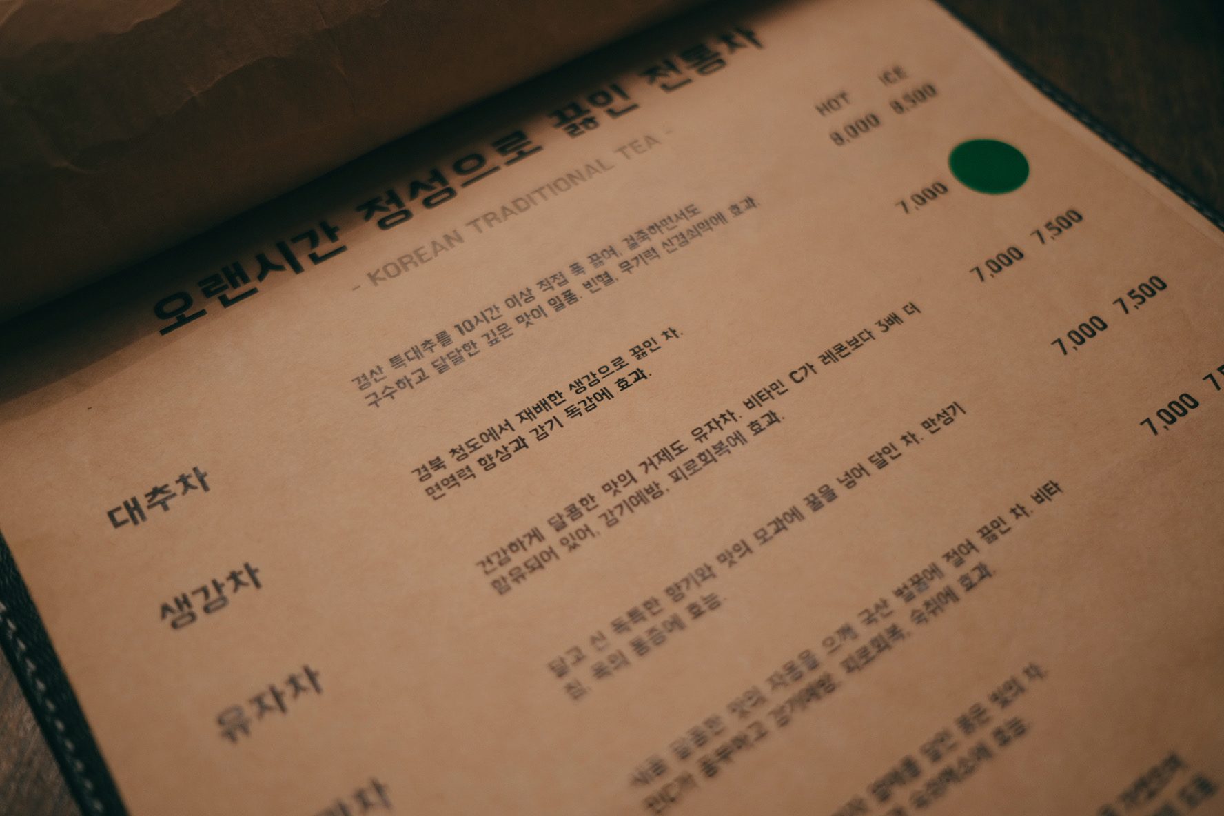 - 제가 마신 밀크티나 와이프가 마신 차까지 아주 맛이 좋았습니다. 반가운 것은 경산에서 근무하고 있는 저는, 경산대추차가 너무 반가웠고 유명한 것을 이미 알고 있어서 조금 놀랐습니다. 또한 고향인 청도에서 난 생강차를 쓰고 있어서 다시 한 번 놀랐다는 점. 전국 각지에 유명한 식재료를 바탕으로 국산차를 제공하는 것이 너무 좋았습니다. 뿐만 아니라