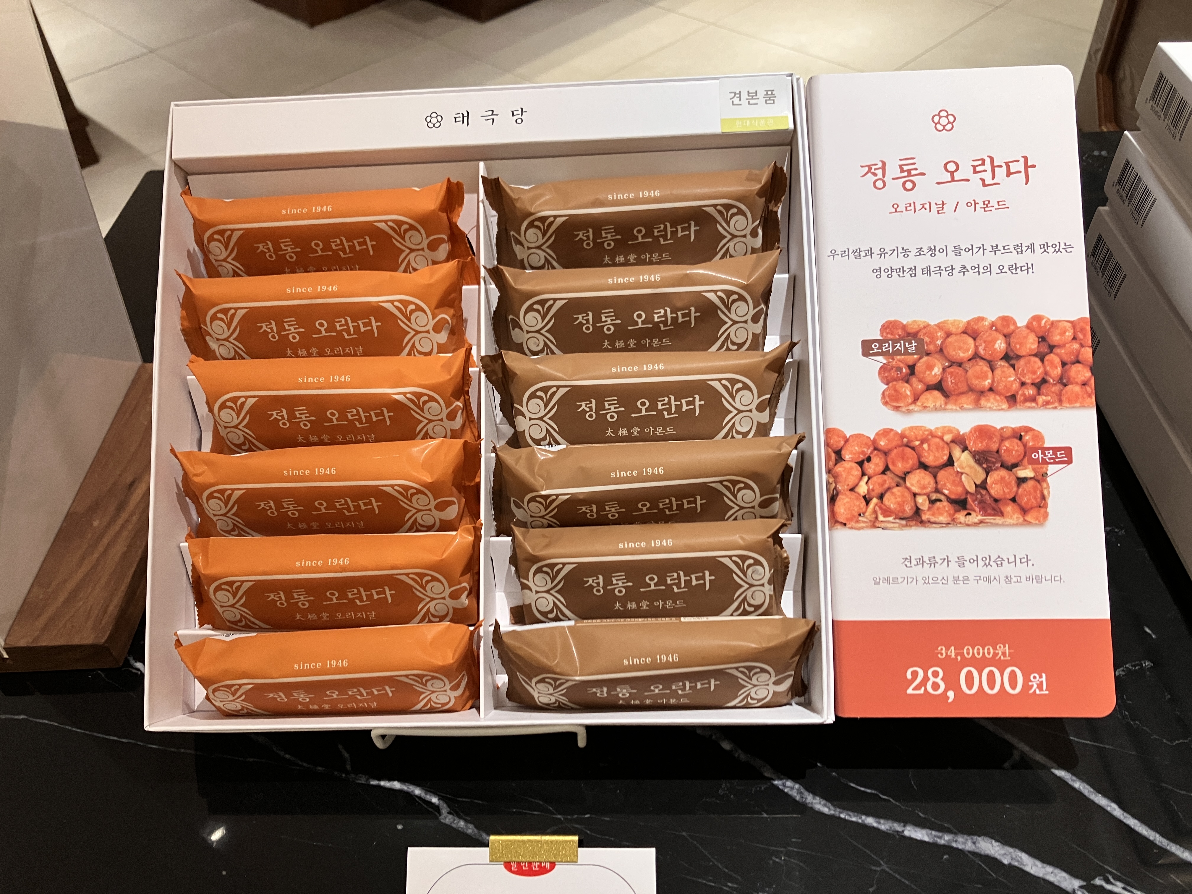 - 아이가 생기고 나서부터 할머니 댁을 많이 방문하는데 분명 좋아하시는 과자들이지만 선물로 사기에는 시장바닥에서 사오는 것이 조금 불편했으나 태극당에서 사가면 고급스러워서 선물하기 좋았습니다. 고급스러운 포장의 오란다, 정통캬라멜, 남대문 전병 등은 명절에 하나 둘 사가기 참 좋습니다.
